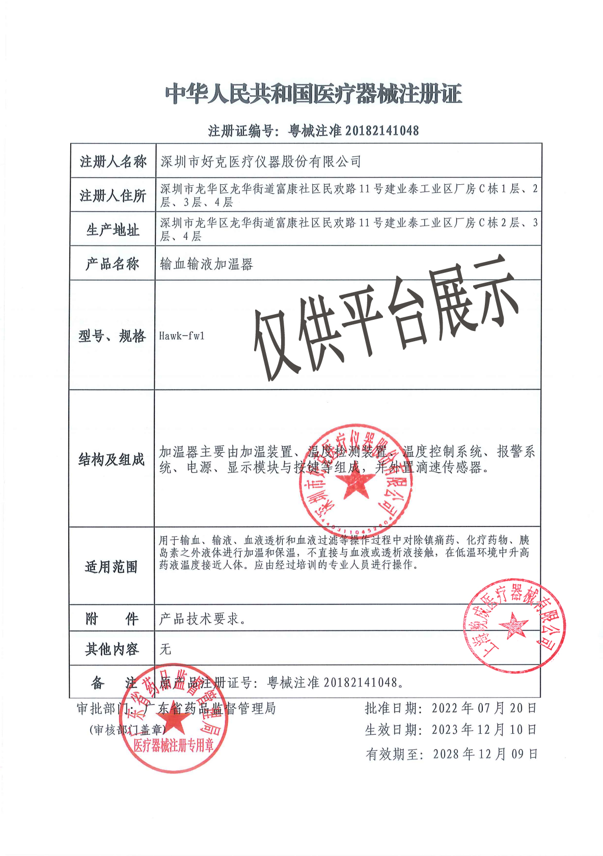 產(chǎn)品名稱 : 深圳好克 輸血輸液加溫器 Hawk-fw1型